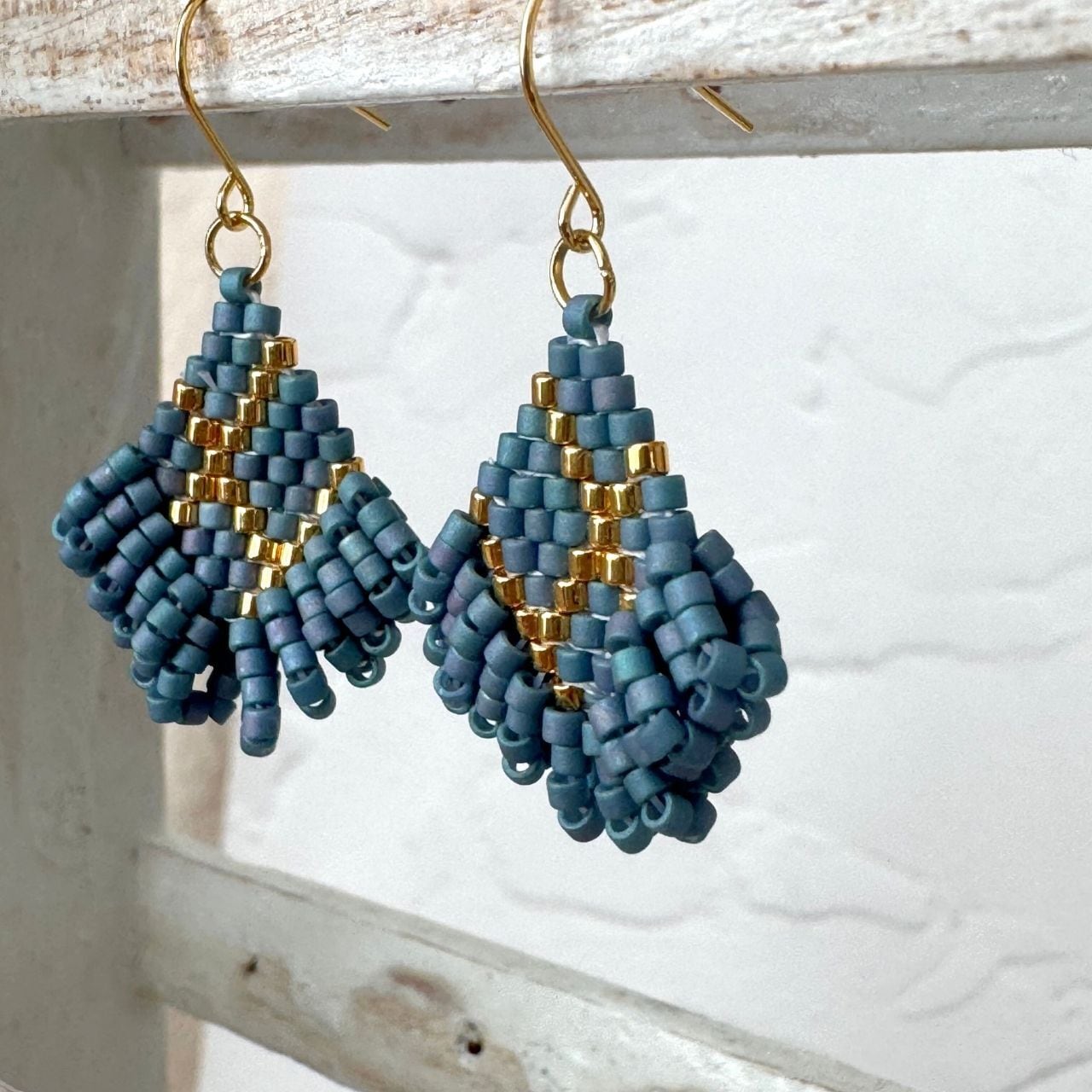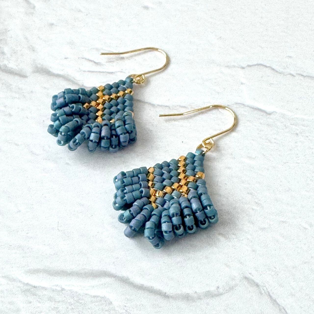 クロスラインループフリンジ デニムブルー ビーズアクセサリー ピアス イヤリング 金属アレルギー対応 シンプル