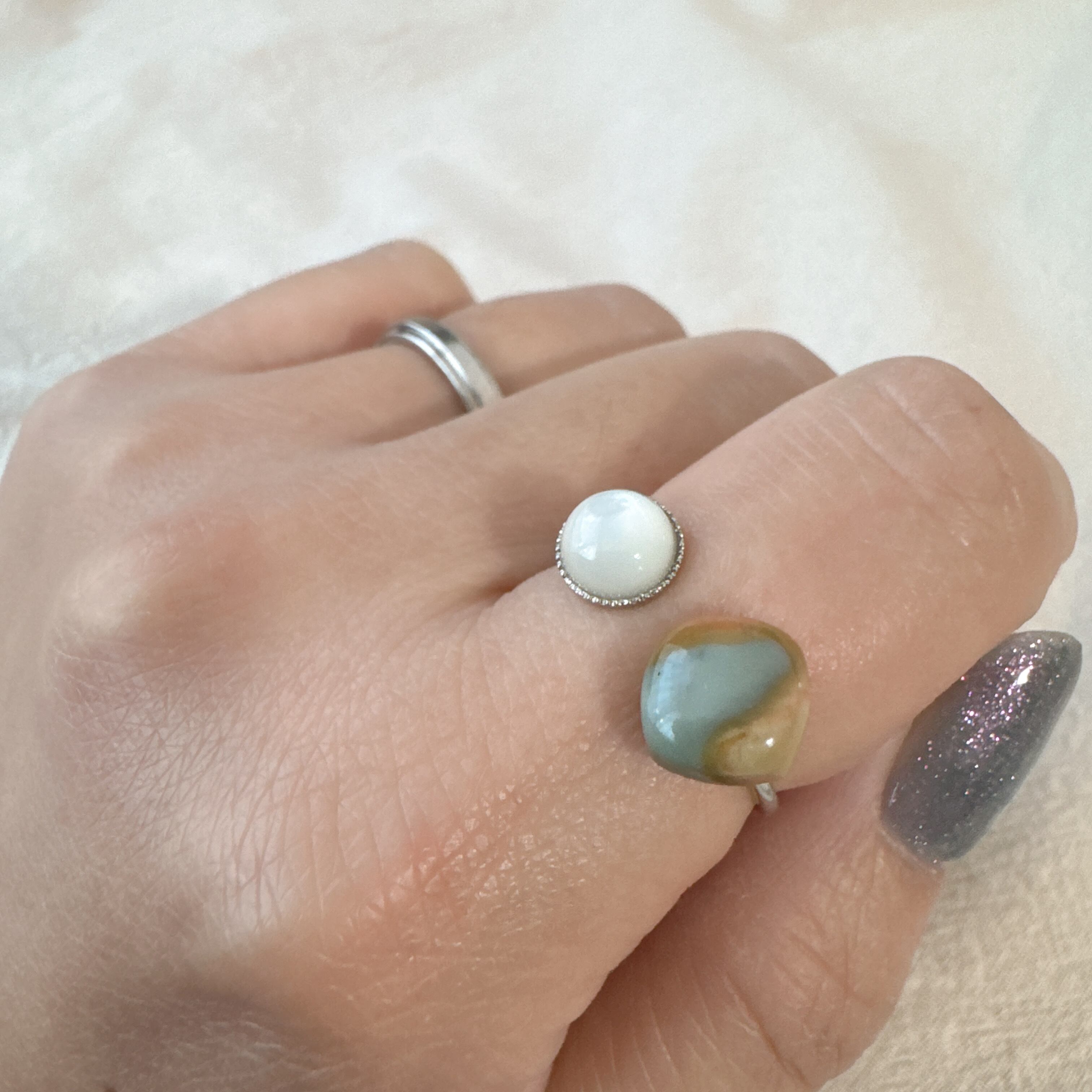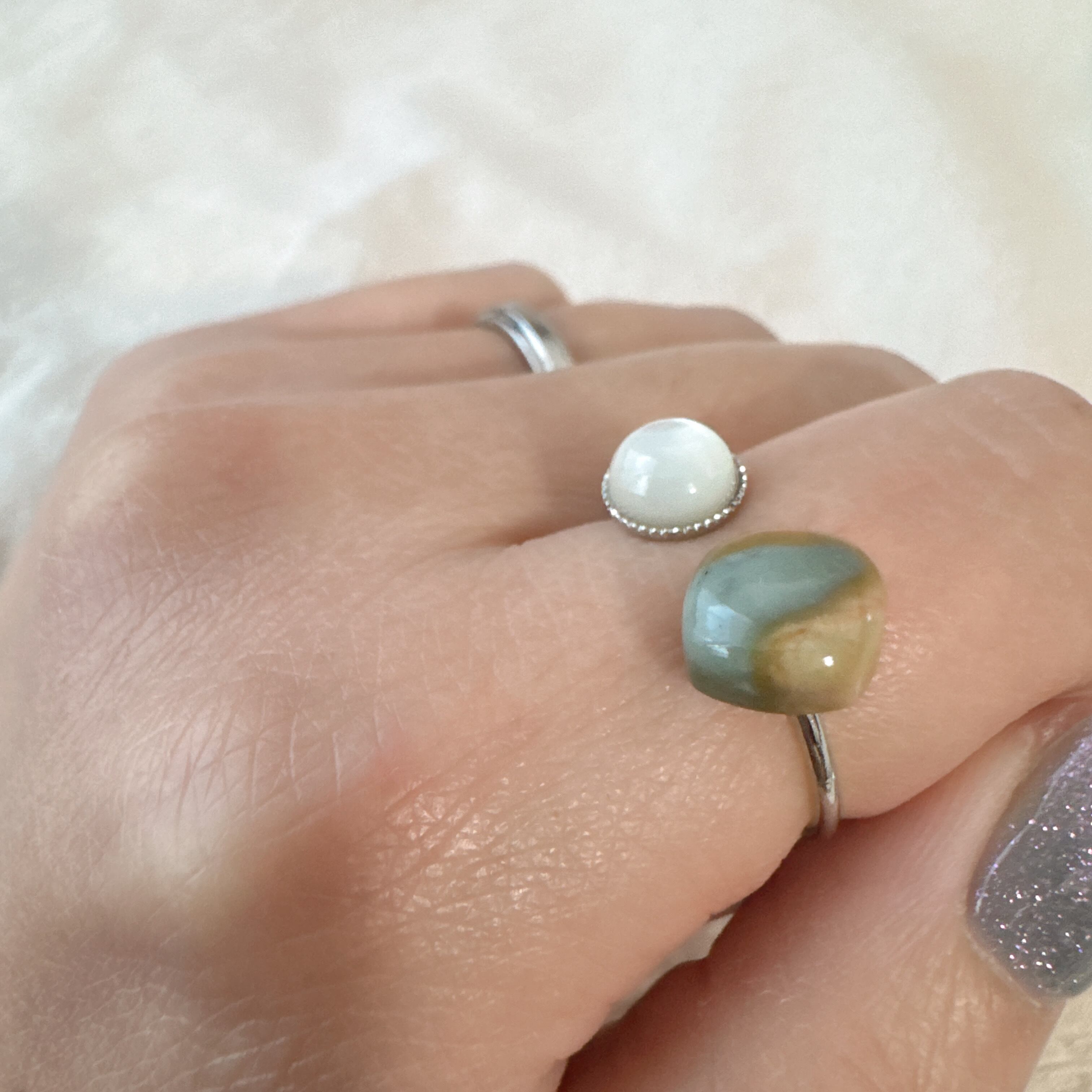 こちらは、ポリクロームジャスパーとマザーオブパールのアジャスタブルリングです。
